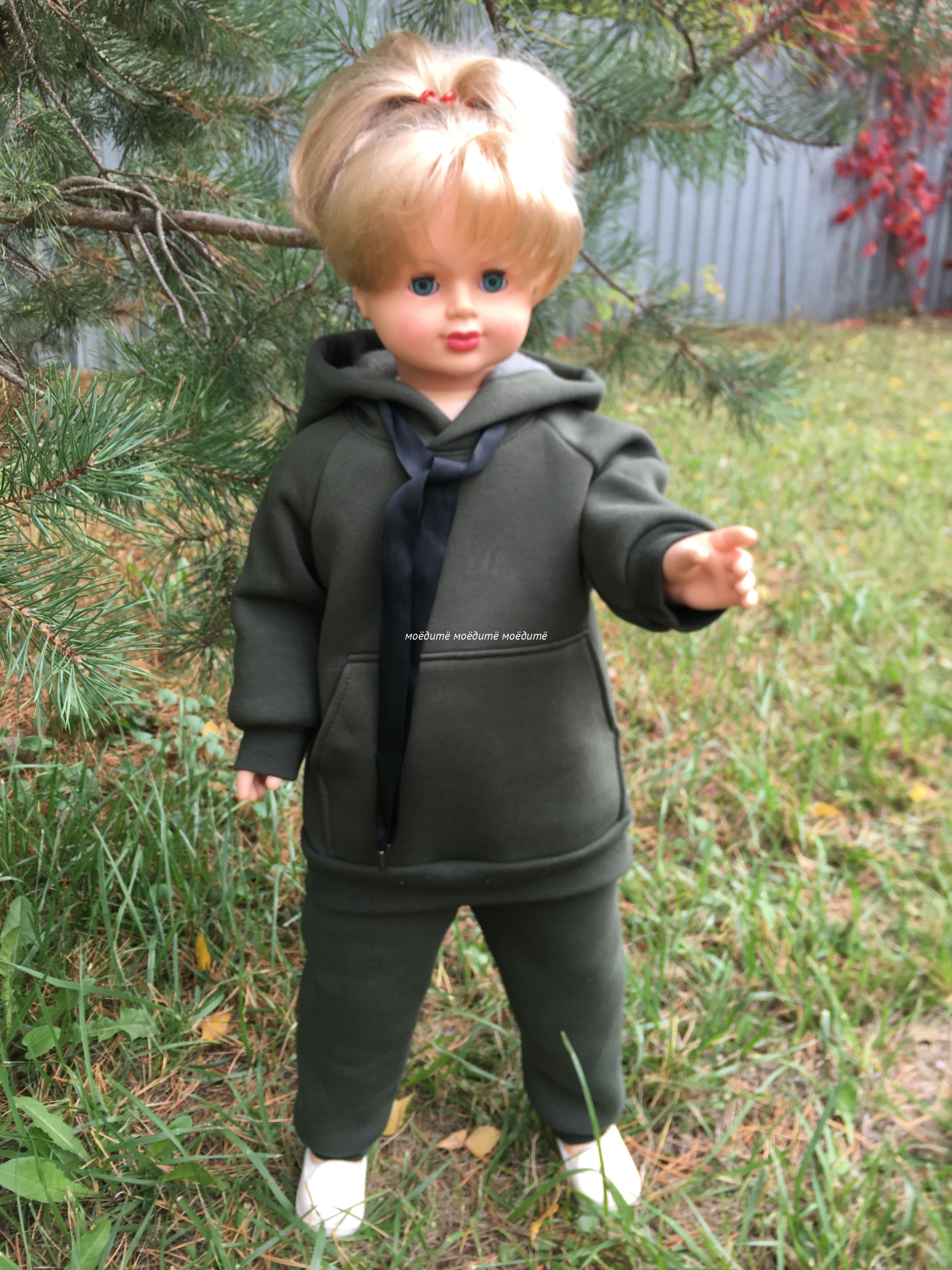 Костюм выполнен из футера трёхнитки с начёсом. Костюм состоит из толстовки с капюшоном, спереди с карманом "кенгуру", на рукавах манжеты. В комплект входят брюки сверху на широкой резинки, снизу на манжетах. И толстовка и брюки декорированы шнурком.